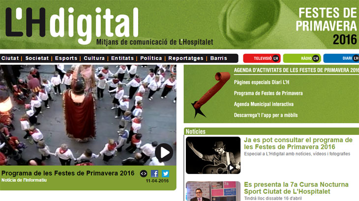 A través del portal L’Hdigital se puede acceder al especial de Fiestas de Primavera 2016 que ya se ha puesto en marcha donde es bien visible toda una parrilla de opciones relacionadas con las fiestas mayores de L’Hospitalet.